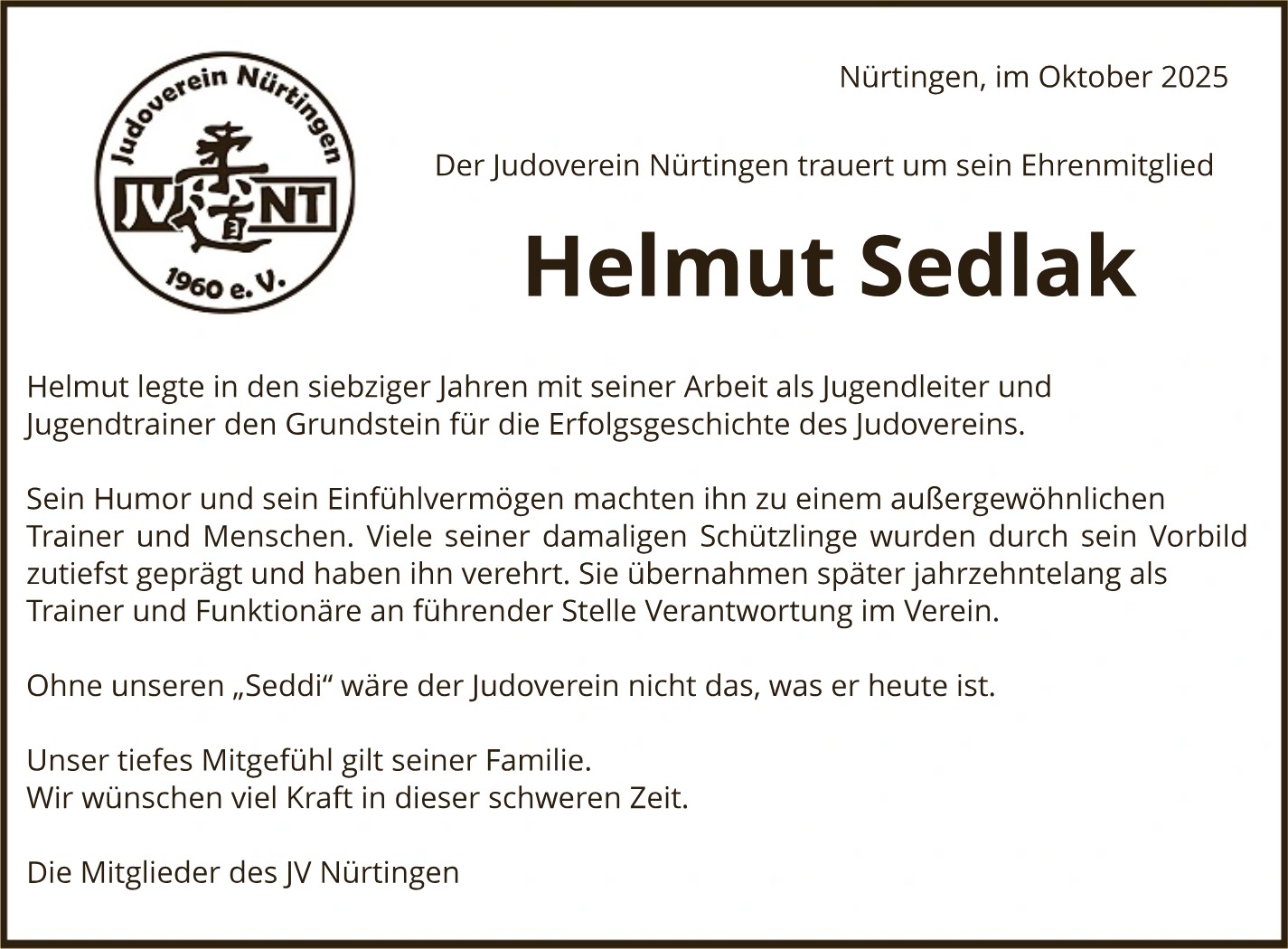 Die Trauerfeier findet am Mittwoch, 5. November 2025 um 13 Uhr auf dem Waldfriedhof Nürtingen statt. Anstelle von Blumen und Kränzen bittet die Familie um eine Spende an die Brückenpflege Stella Care in Esslingen. Betreff „Helmut“, IBAN: DE70 6115 0020 0102 1630 58.